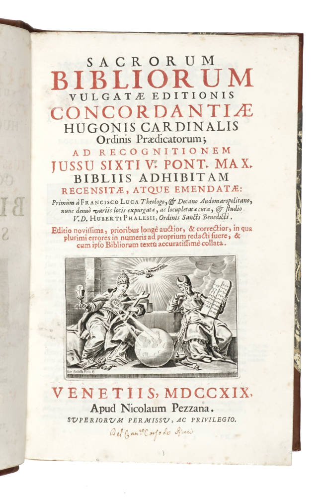 In-folio (mm 298x190), Carte [6], Pagine 1030 ma (1028) per errore di numerazione. 3 colonne. Titoli in rosso e nero; sotto, una vignetta incisa di Suor Isabella Piccini. Legatura in mezza pelle moderna con applicato al dorso parte della pelle coeva. Piatti in cartone marmorizzato e sguardie moderne. Lievi arrossature ma Buon esemplare.