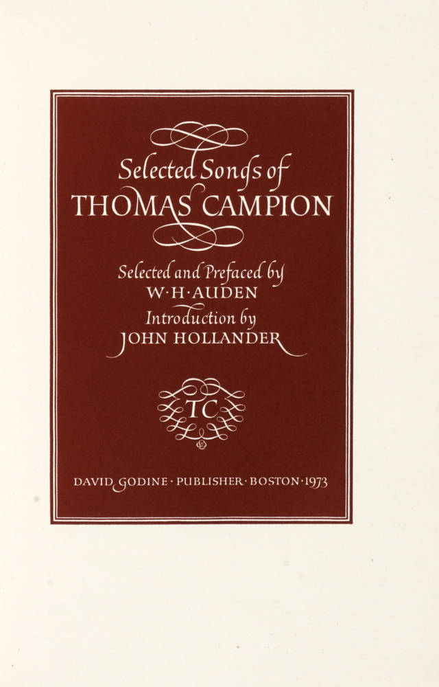 Selected Songs of Thomas Campion. Selected and Prefaced by W.H.Auden. Introduction by John Hollander.