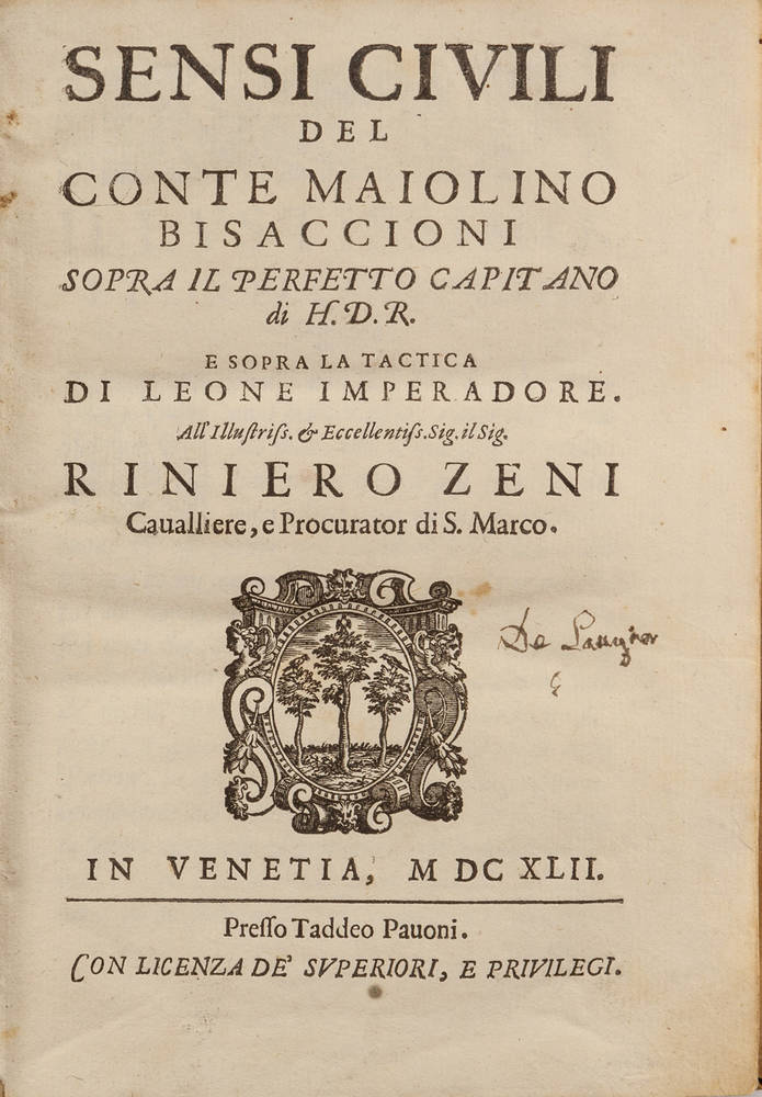 D'Ayala, 8: "Sono alcuni, i quali credono il Bisaccioni di Jesi e non di Forlì, ed il Paitoni lo dice di Ferrara". Edizione originale.