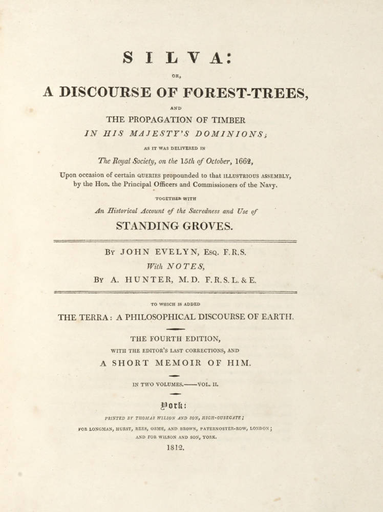 Silva: or, a discourse of forest-trees, and the propagation of timber in his Majesty's Dominions as it was delivered in The Royal Society, on the 15th of October, 1662...With notes by A. Hunter. The Fourth Edition.