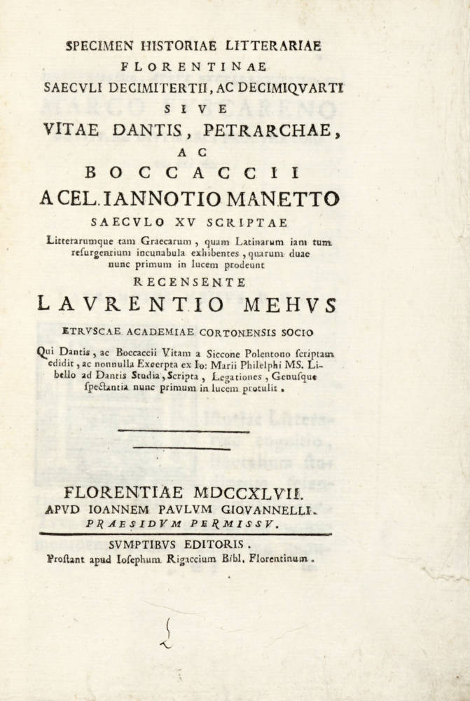 Specimen Historiae Litterariae Florentinae...Sive Vitae Dantis, Petrarchae, ac Boccaccii... Recensente Laurentio Mehus...