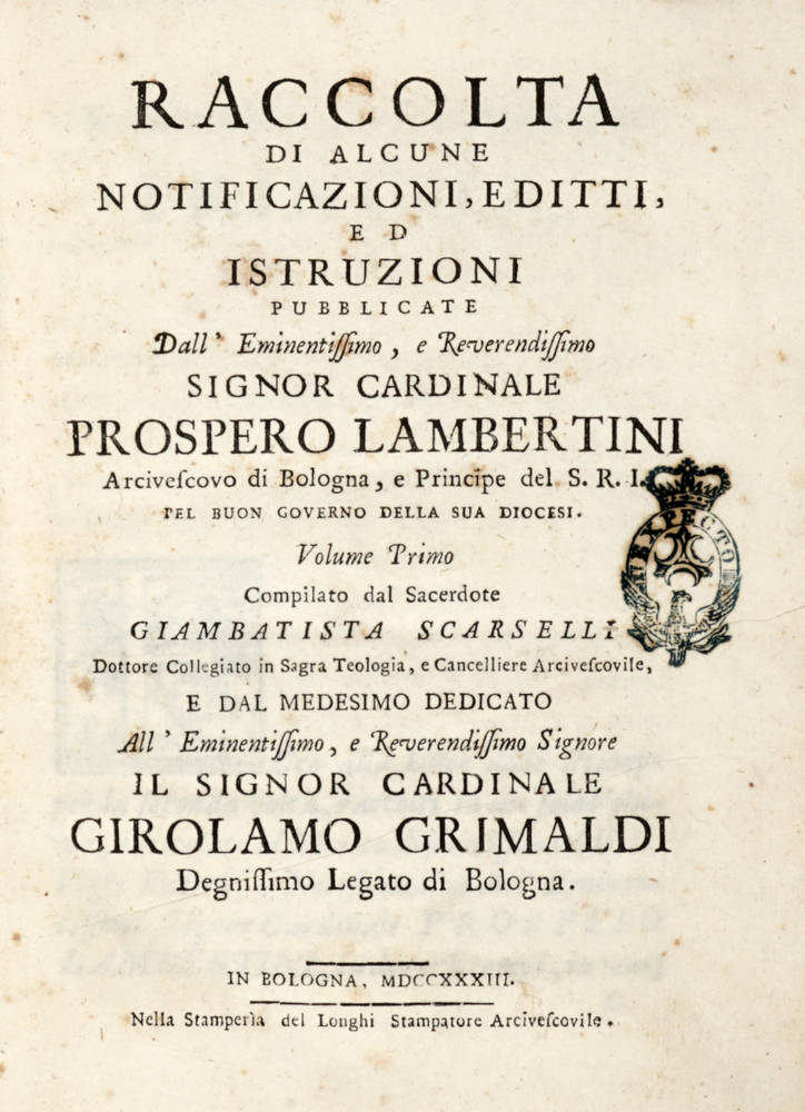 (Statuti). RACCOLTA di alcune notificazioni, editti, ed istruzioni pubblicate dal...cardinale Prospero Lambertini arcivescovo di Bologna...Volume Primo (su 5), compilato dal sacerdote Giambatista Scarselli.