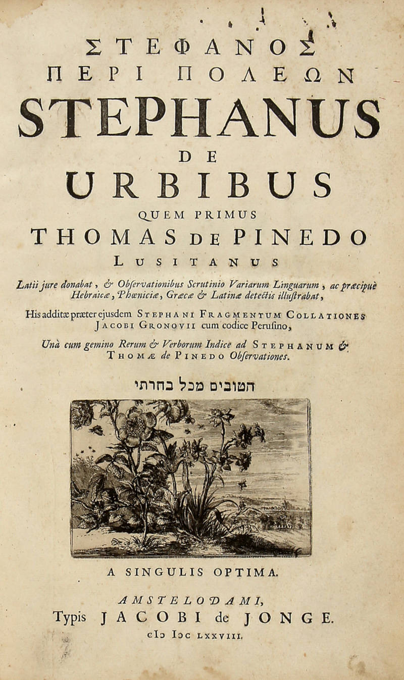 Stephanus de Urbibus, quem primus Thomas de Pinedo Lusitanus Latii jure donabat, et observationibus scrutinio variarum linguarum, ac praecipuè Hebraicae, Phoenicae, Graecae et Latinae detectis illustrabat, His addiate praeter ejusdem Stephani Franmentum collationes Jacobi Gronovii cum codice Perusino...
