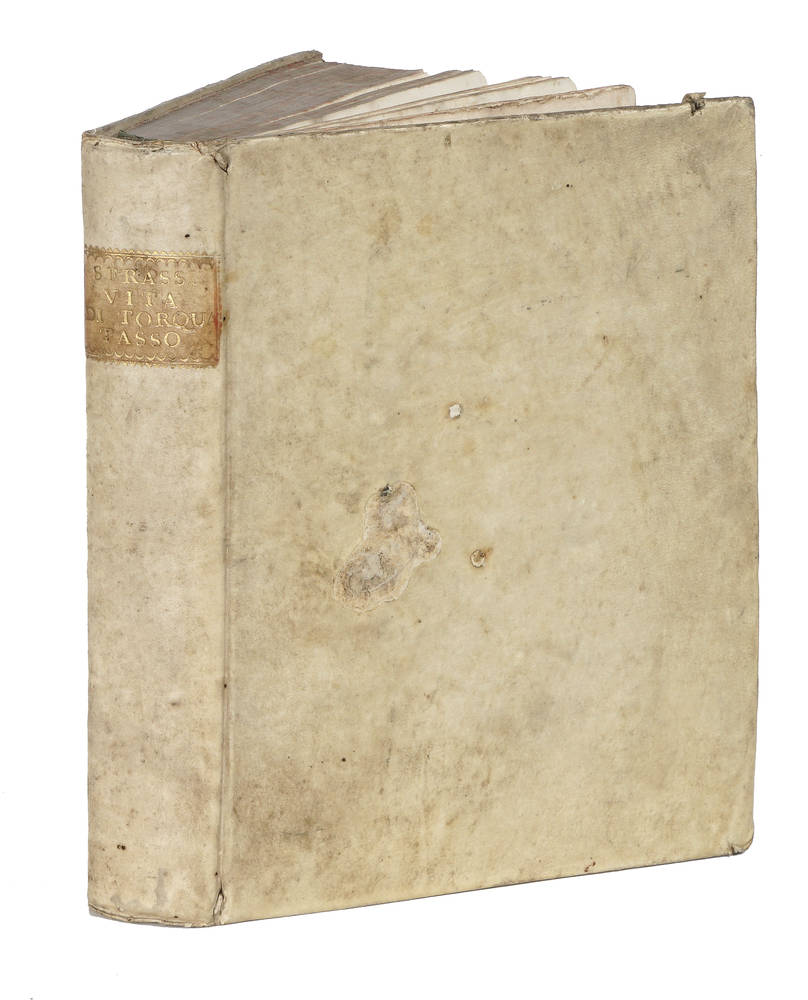 In-4°(mm 272x200), Pagine VIII, 614, manca l'ultima carta bianca finale. Con i ritratti incisi in rame di Bernardo e di Torquato Tasso. Graziose iniziali figurate. Esemplare in carta grave, un po' corto ai margini. Legatura in piena pergamena coeva un po' allentata, tagli spruzzati in rosso. Fori di tarlo che non ledono il testo alla prima parte e nella parte centrale dell'opera e altre lievi arrossature sparse.