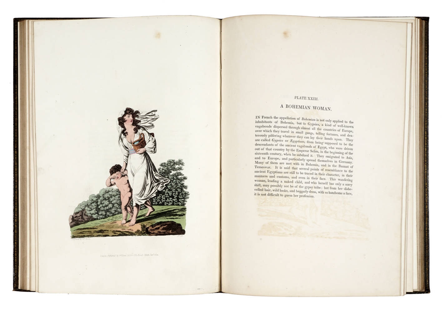 In-folio piccolo (mm 360x255), Carte [3], Pagine XXVIII (Contiene 2 frontespizi, Indice tavole, Avvertenze, Avviso e l'Introduzione). Con 50 tavole in coloritura originale inc. da W. Ellis e W. Poole accompagnate da altrettante carte di testo in inglese e francese. Legatura in pelle verde coeva, con impressioni e fregi oro ai piatti, tagli dorati, titolo oro al dorso. Lievi minime tracce di foxing ma ottimo esemplare.