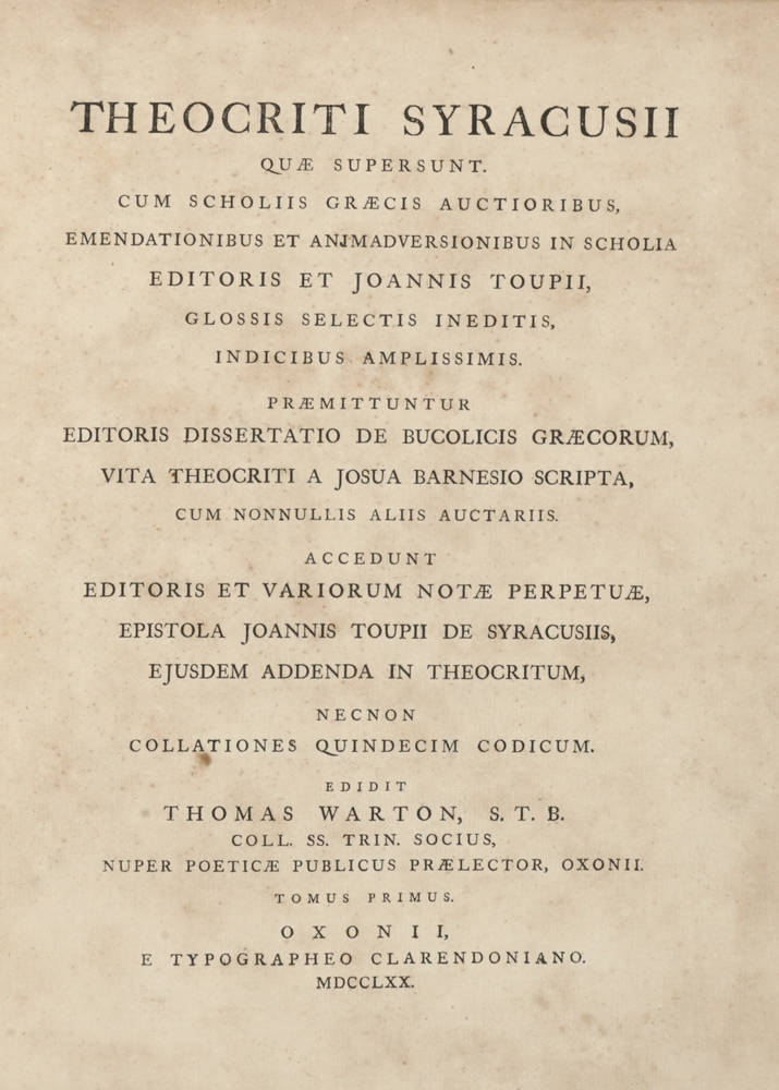 Theocriti Syracusii quae supersunt, cum scholiis graecis auctoribus, emendationibus et animadversionibus in scholia editoris et Joannis Toupii...Edidit Thomas Warton.