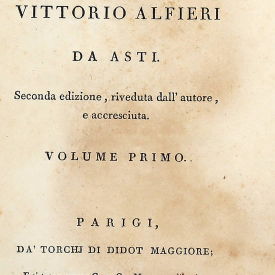 Il primo volume delle Tragedie, iniziato a comporre nel maggio 1787, fu terminato entro l'anno (nel dicembre 1787 «si trovò stampato il primo volume», Vita IV, 18), ma la malattia che nell'autunno aveva colpito l'autore, impedì di emendare il Filippo, il Polinice, l'Antigone. Così che nel 1789, quando si concluse l'impressione dei cinque volumi, provvide a far ricomporre il primo. Quello dell'87 fu smembrato: le tragedie formarono il sesto tomo della Didot, definito nel frontespizio, sotto il titolo Volume di scarto. Il Volume di scarto, di 272 pagine, fu detto tale sia perché accolse una lezione non ancora definitiva delle prime tre tragedie, sia perché mancava di quelle CXX pagine in prosa che sarebbero servite al primo, riconfezionato per ultimo nel 1789, a raggiungere la dimensione di pagine CXX+280 ed a rientrare, quindi, nella mole media calcolata per ciascuno degli altri volumi. Biblioteca Medicea Laurenziana, cat. mostra Il poeta e il Tempo. Firenze, 2003. Gamba 2527: "tra il novero stragrande di edizioni di queste tragedie va tenuta la presente in singolare pregio, essendo stata assistita dall'Autore medesimo". Brunet I, 176: "Cette belle edition n'est pas commune et elle a ete jadis fort recherchee"; Razzolini, 12. Graesse I, 74. Domenico Fava cat. Mostra storico astese alfieriana, Asti 1949.