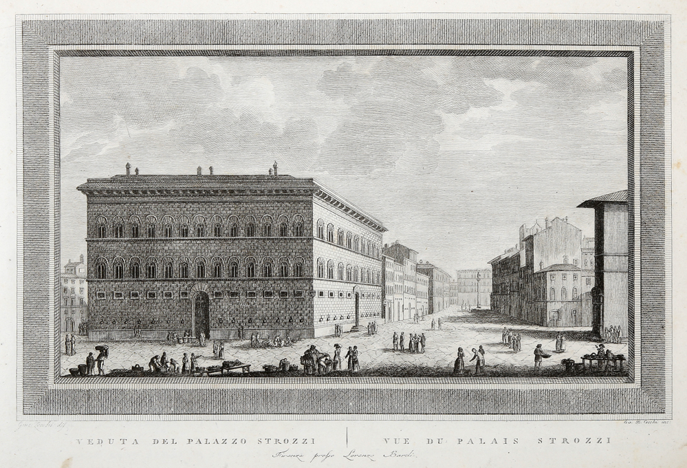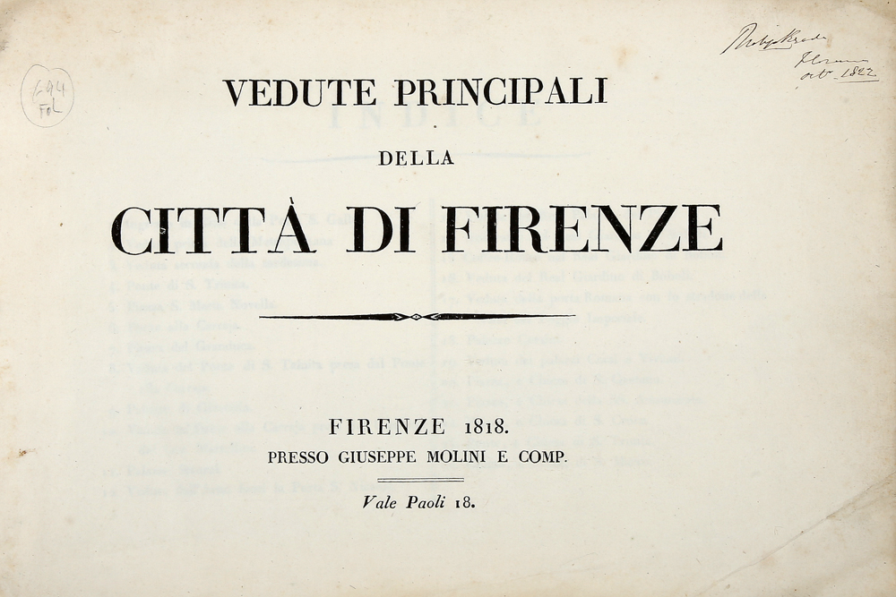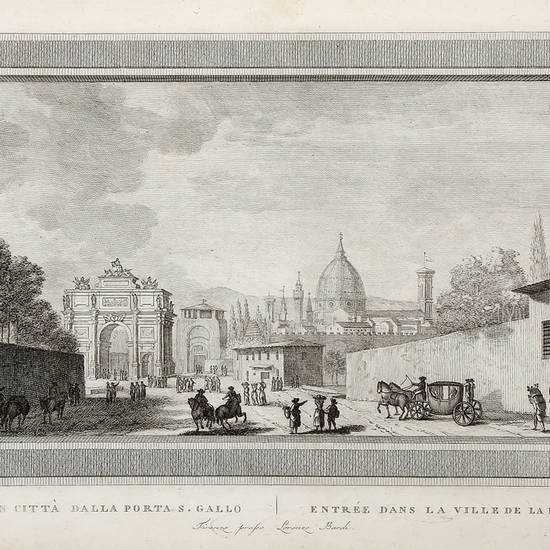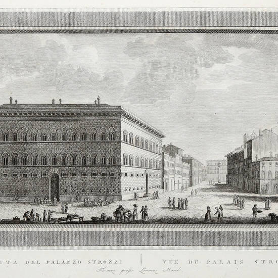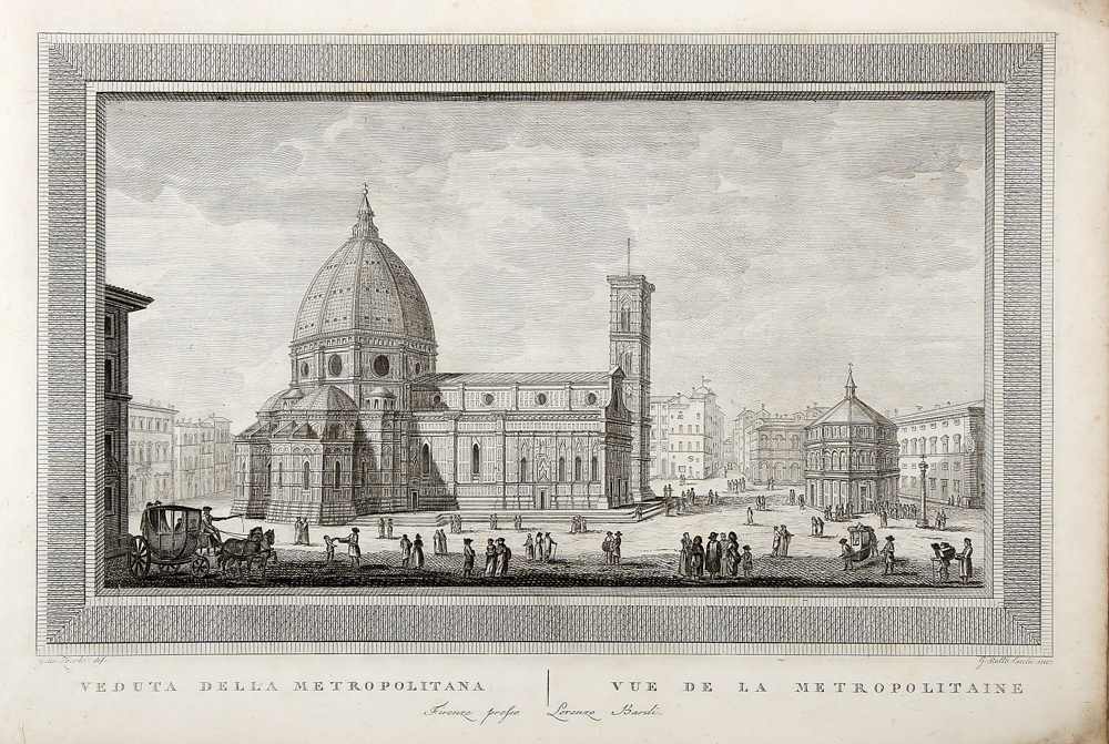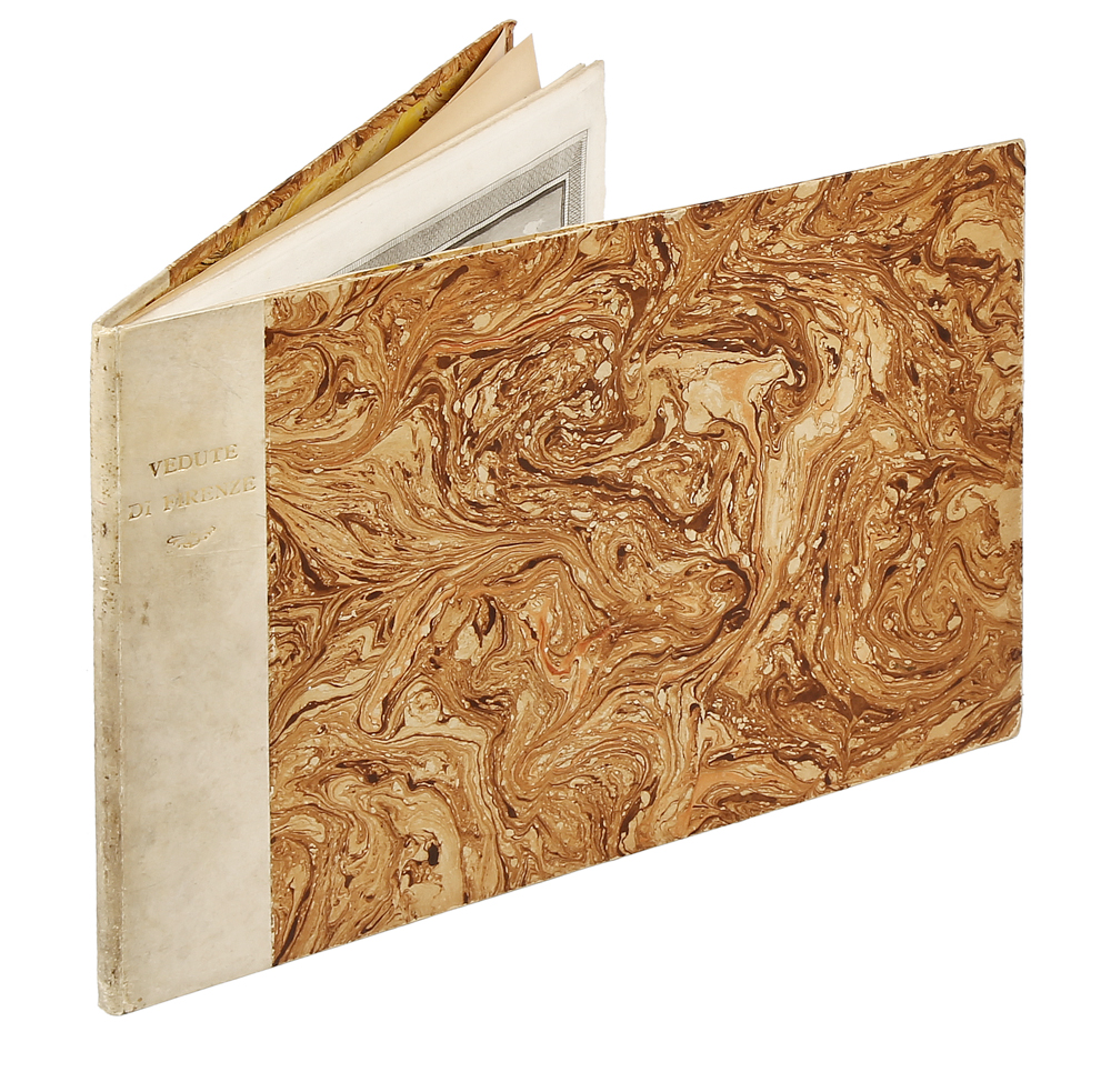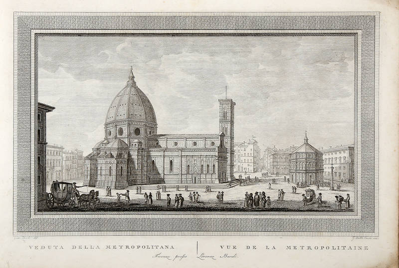 Album in-4° oblungo (mm 250x355), carte [2] (tit. e indice delle vedute tipografici), + 24 tavole numerate di vedute riquadrate da incorniciature inc.in rame, con doppio titolo in italiano e in francese. Sotto al tit.: "Firenze presso Lorenzo Bardi". Legatura in mezza pergamena ottocentesca, piatti e sguardie marmorizzate. Titolo oro al piatto sup. Bellissimo esemplare.