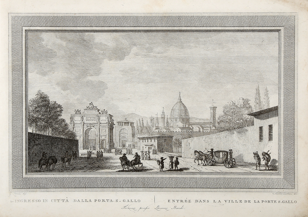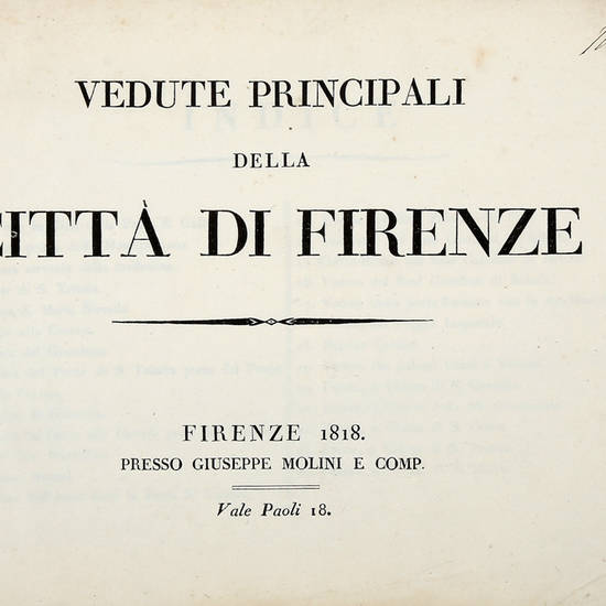 Raccolta completa di vedute di Firenze incise da Matteo Carboni e Giovan Battista Cecchi, ispirate a soggetti in prevalenza di Giuseppe Zocchi (ma anche di Cosimo Rossi, Giuseppe Puliti e Giuseppe Terreni) e da ciò denominata comunemente "Zocchi piccolo" o "Zocchino". In realtà la serie ripete solo alcuni soggetti della Scelta di XXIV vedute del 1744, mentre altre tavole "zocchiane"-nelle quali l'attribuzione allo Zocchi parrebbe apocrifa-sono completamente diverse. Fu edita, per la prima volta, da Giuseppe Bardi verso il 1800, stando a quanto dichiarato da Mori-Boffito, 95, che descrive l'esemplare del fondo Cappugi della Biblioteca Nazionale di Firenze, composto però di sole 20 tavole. Moreni, II, 223 e Bigazzi, n° 5284, 191 riportano, invece, una consistenza di 23 vedute. Sempre Mori-Boffito riferisce che verso il 1830 la serie ebbe una ristampa a cura di Lorenzo Bardi. Dal raffronto di questo nostro esemplare con quella edizione posteriore, abbiamo potuto appurare che furono successivamente aggiunte altre 2 tavole (Palazzo Medici Riccardi e Palazzo delle Cascine, arrivando ad un totale di 26 tavole), tolte sia le incorniciature che i nomi degli incisori, ricomposto il titolo (solo in francese), mentre le incisioni furono ritoccate o forse addirittura reincise. La presente copia, pertanto, rappresenta un'edizione intermedia, rara e sconosciuta alle fonti bibliografiche, che reca in calce alle incisioni il nome di Lorenzo Bardi, ma sul frontespizio tipografico datato 1818 riporta curiosamente la dizione "presso Giuseppe Molini e Comp.".
