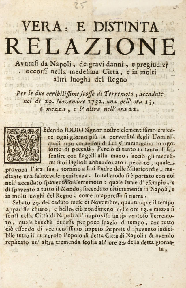 VERA, e distinta relazione avutasi da Napoli, de gravi danni, e pregiudizj occorsi nella medesima Città, e in molti altri luoghi del Regno per le due orribili scosse di Terremoto, accaduto nel dì 29 NOvembre 1732, una nell'ora 13 e mezza, e l'altra nell'ora 22.