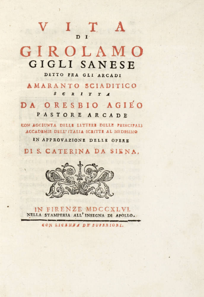 Vita di Girolamo Gigli Sanese detto fra gli Arcadi Amaranto Sciaditico scritta da Oresbio Agièo (pseud.)...Con Aggiunta delle lettere delle principali accademie dell'Italia scritte dal medesimo in approvazione delle Opere di S. Caterina da Siena.