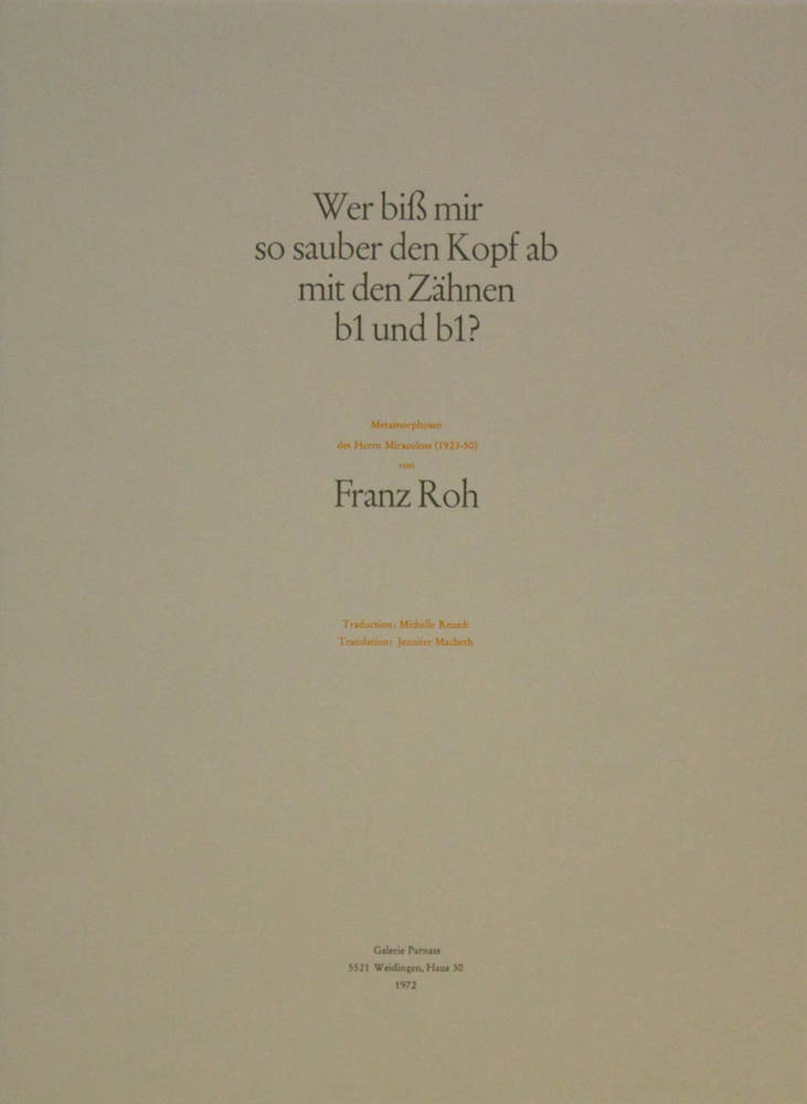 Esemplare N.402 di una tiratura di complessivi 530 esemplari numerati. La serie di collages, raccolti in questo volume, furono inizialmente esibiti nella Galleria Parnass a Wuppertal, ma tra il 1963 e '65 venne realizzata l'idea di un libro sulla storia del faustiano signor Miracoloss dal corpo "metafisico" e dalle incredibili esperienze. Il loro carattere "surrealista" ricorda per molti aspetti quello dei collages di Max Ernst. Franz Roh (1890-1965), storico dell'arte, fotografo ed infine docente universitario, fu autore di un saggio del 1925, dal titolo Post-Espressionismo, Realismo Magico. Problemi della pittura contemporanea europea. Col termine "Magischer Realismus" si voleva indicare un ritorno in pittura-solo in seguito anche in letteratura-al realismo, anche se appunto un realismo magico, poiché "noi riconosciamo questo mondo sebbene adesso lo guardiamo con altri occhi, e non solo perché siamo riemersi da un sogno". Caratteristica primaria dello stile magico-realista-di cui in letteratura abbiamo egregi rappresentanti mondiali, arrivando fino a Gabriel Garcia Marquez, Günter Grass e John Fowls-è l'intreccio tra realtà e fantasia. La scelta di un tipo di pittura che si avvicina ai dettagli della miniatura, viene preferita per il suo offrirci "delights and intimate charms". Nel medesimo periodo in cui Roh coniò il suo "realismo magico", Gustav Hartlaub chiamò questo medesimo stile artistico "Nuova Oggettività". inoltre deplorò la fotografia come mera derivazione dalla pittura, affermando che essa è un'arma efficace contro la meccanizzazione dello spirito ed una delle più grandi meraviglie nel campo della fisica, della chimica e della tecnologia. Dalla collaborazione col disegnatore grafico svizzero-tedesco Jan Tschichold, nacque uno dei suoi lavori più famosi e discussi, Foto-Auge (76 fotografie "d'altri tempi"), pubblicato nel 1929, che lo portò alla incarcerazione voluta dalla censura governativa tedesca. Più tardi, in tempi storici migliori, gli verrà assegnata una cattedra alla Università di Monaco.Roh, Nach-Expressionisum Magischer Realismus. Probleme der Neuesten Europäischen Malerei, Leipzig, 1925.